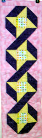 Friendship Star blocks with colorful egg print fabric in the center. This table runner was constructed using quality 100% cotton fabric. Machine pieced and machine quilted by Linda Monasky