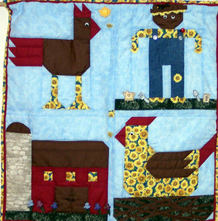 This wall hanging was made for the NH farm museum challenge. It features a scarecrow, chicken, rooster and barn.Constructed using 100% cotton fabrics, embelished with whimsicle buttons.Machine pieced & quilted by Linda Monasky<br /><br />