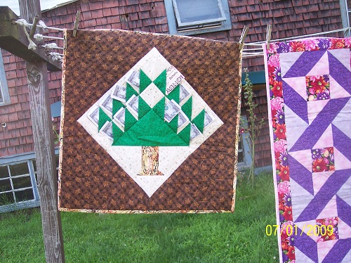 This wall hanging was made for a quilt guild challenge. Tree is covered with "$1,000,000,000" bills.Pieced & quilted by Linda Monasky